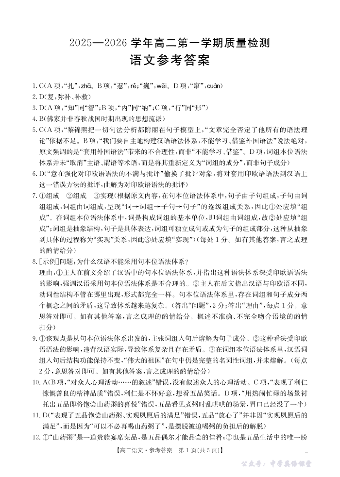 南平市2025-2026学年高二第一学期质量检测 语文答案.pdf