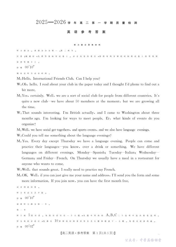 南平市2025-2026学年高二第一学期质量检测 英语答案.pdf