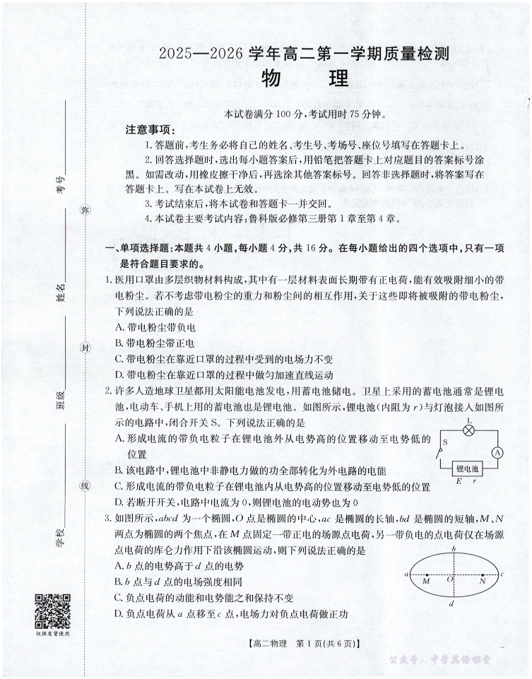 南平市2025-2026学年高二第一学期质量检测 物理.pdf