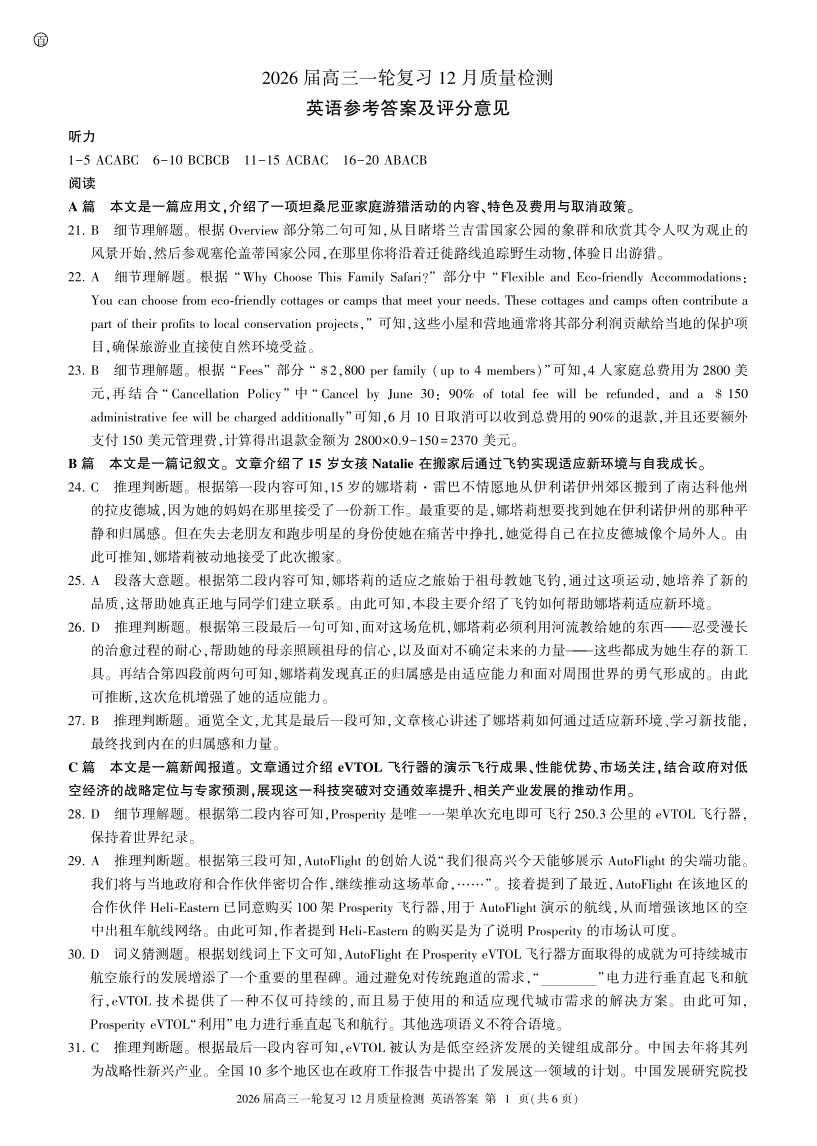 四川省百师联盟2026届高三一轮复习12月质量检测 英语答案.pdf
