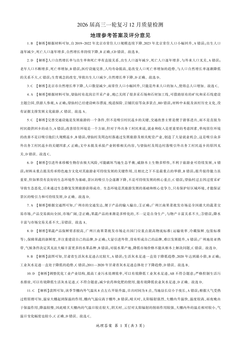 四川省百师联盟2026届高三一轮复习12月质量检测 地理答案.pdf