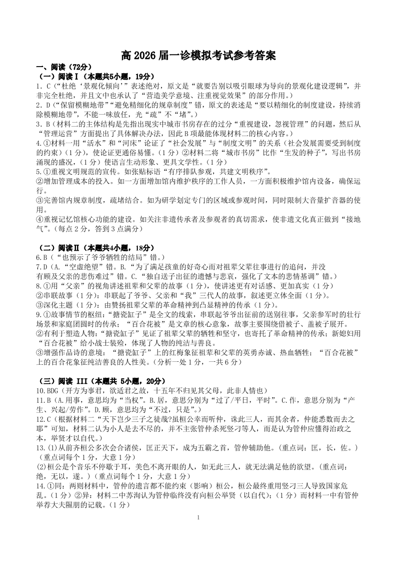 成都市第七中学2025-2026学年度上期高2026届一诊模拟 语文答案.pdf