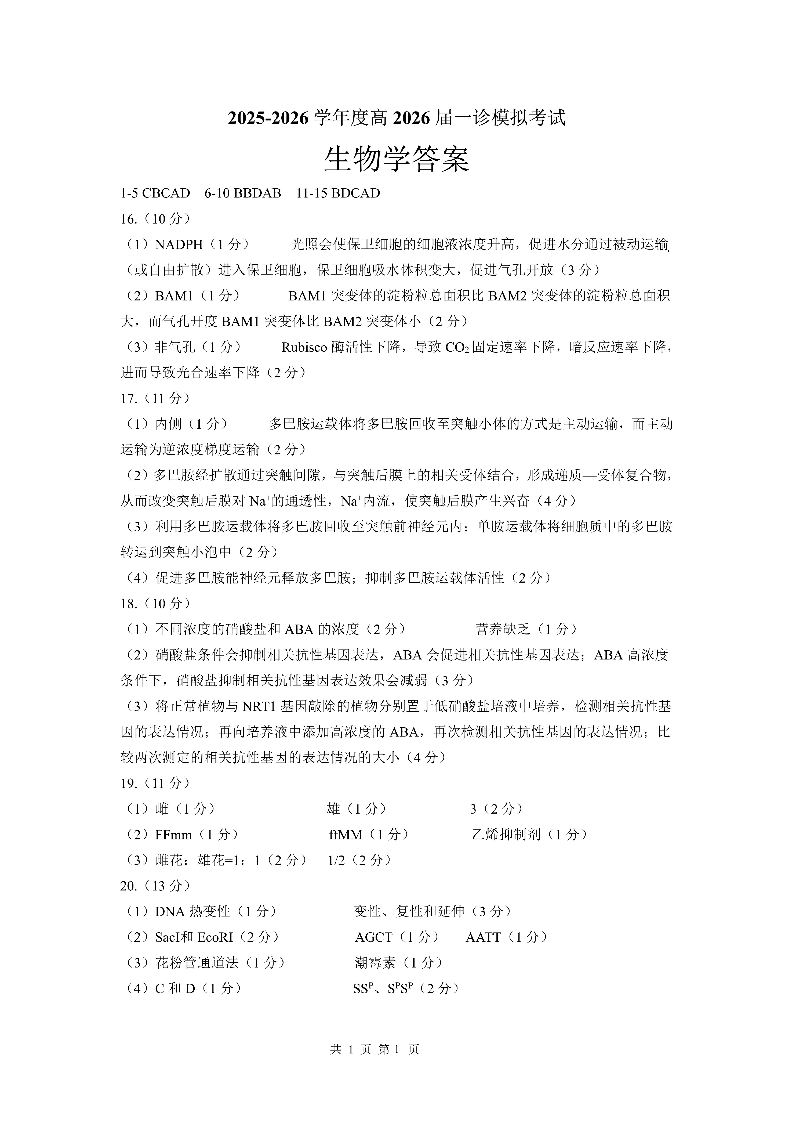 成都市第七中学2025-2026学年度上期高2026届一诊模拟 生物答案.pdf