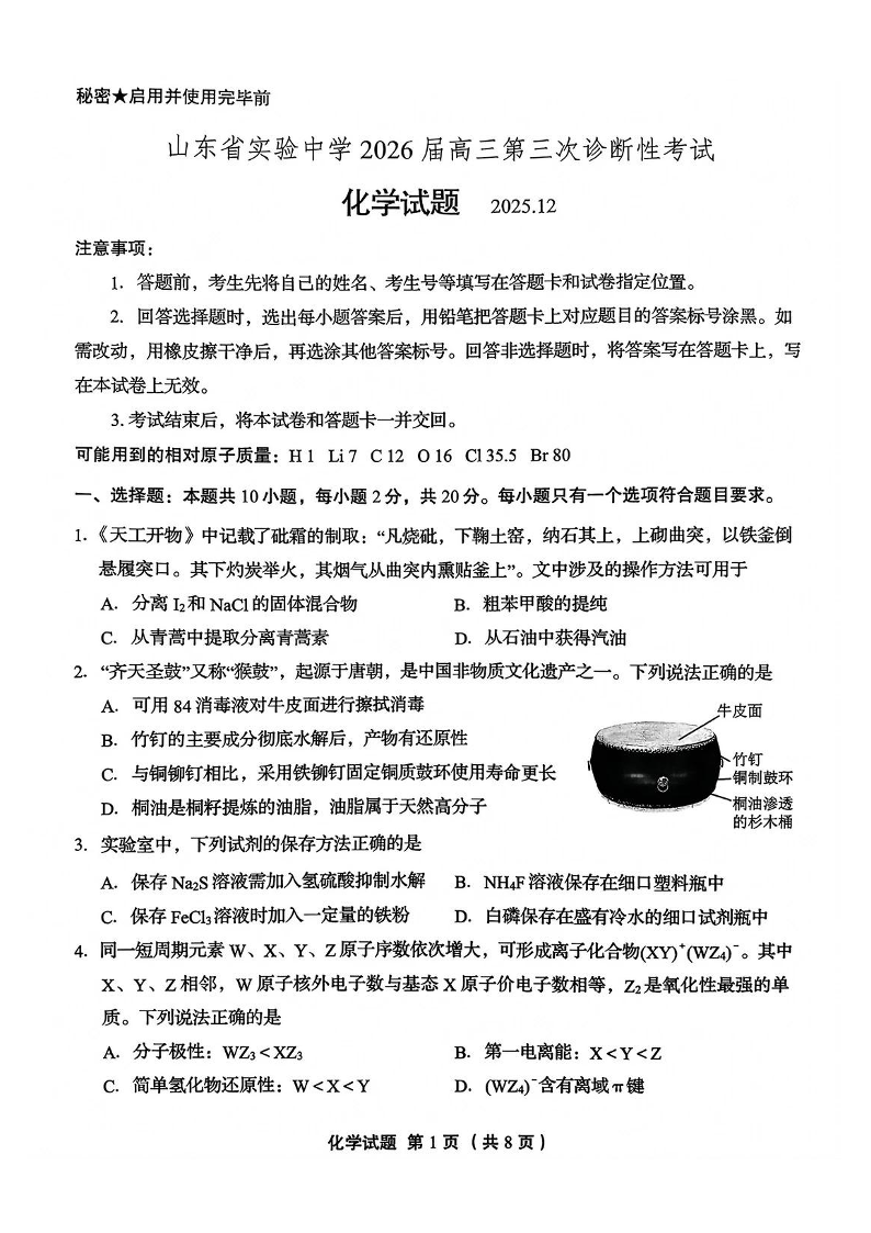 山东省实验中学2026届高三第三次诊断性考试 化学.pdf