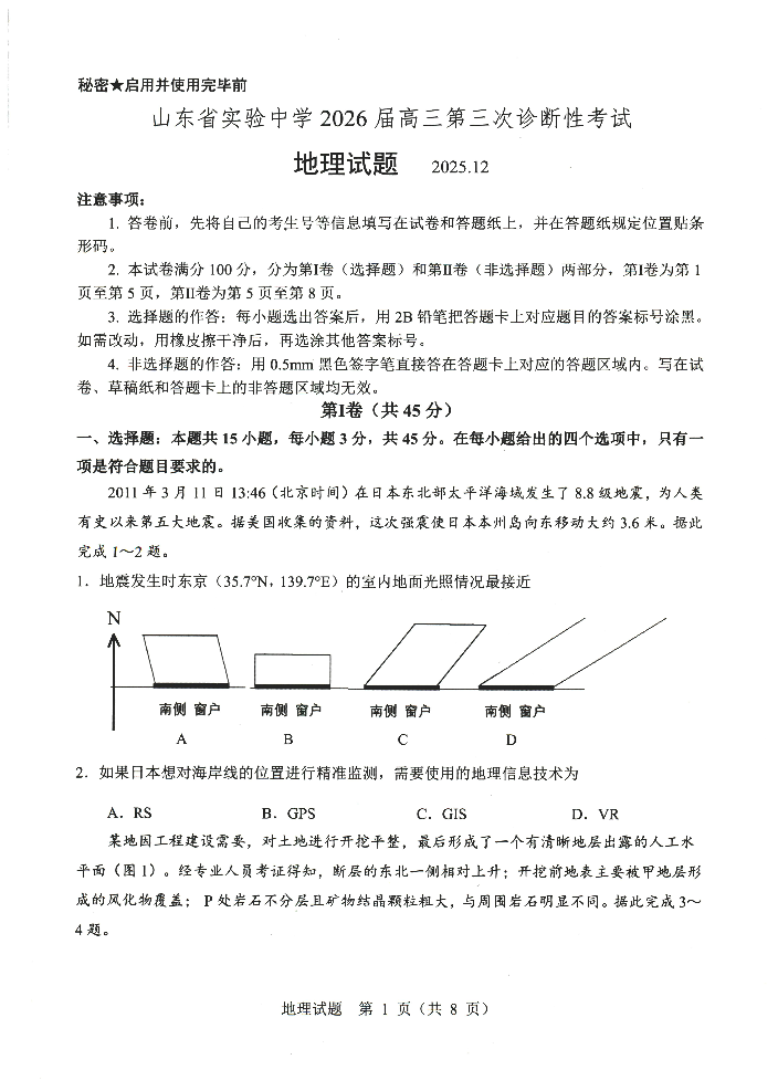 山东省实验中学2026届高三第三次诊断性考试 地理.pdf