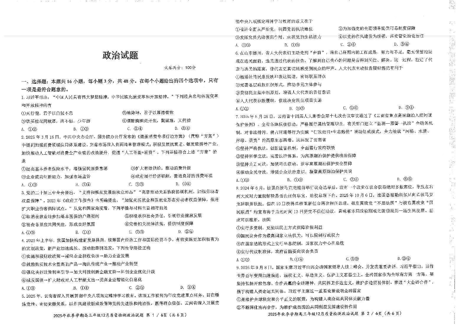 2025年秋季学期高三年级12月质量检測 政治.pdf