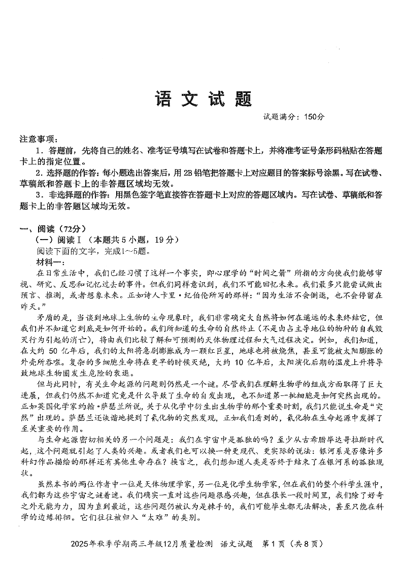 2025年秋季学期高三年级12月质量检測 语文.pdf
