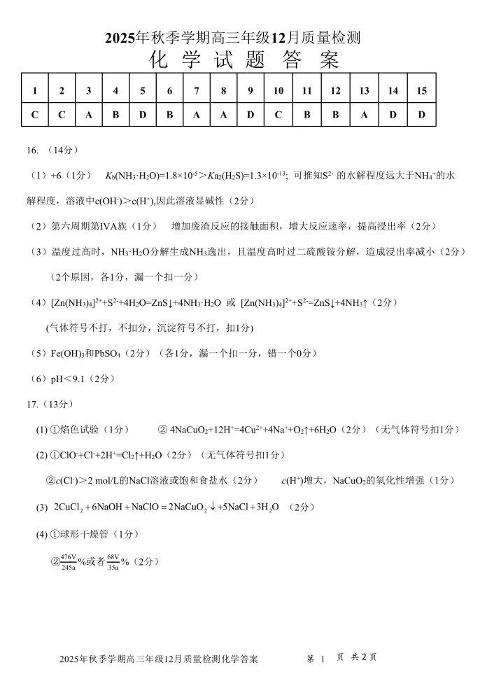 2025年秋季学期高三年级12月质量检測 化学答案.pdf