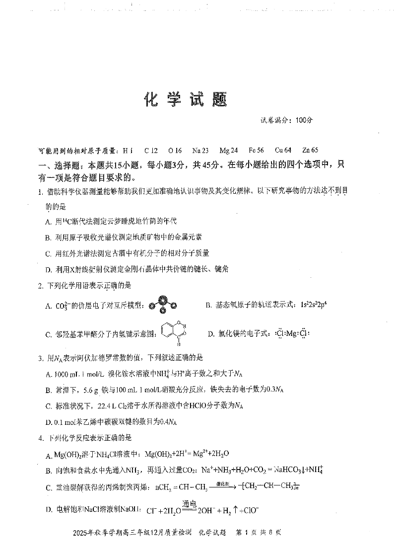 2025年秋季学期高三年级12月质量检測 化学.pdf