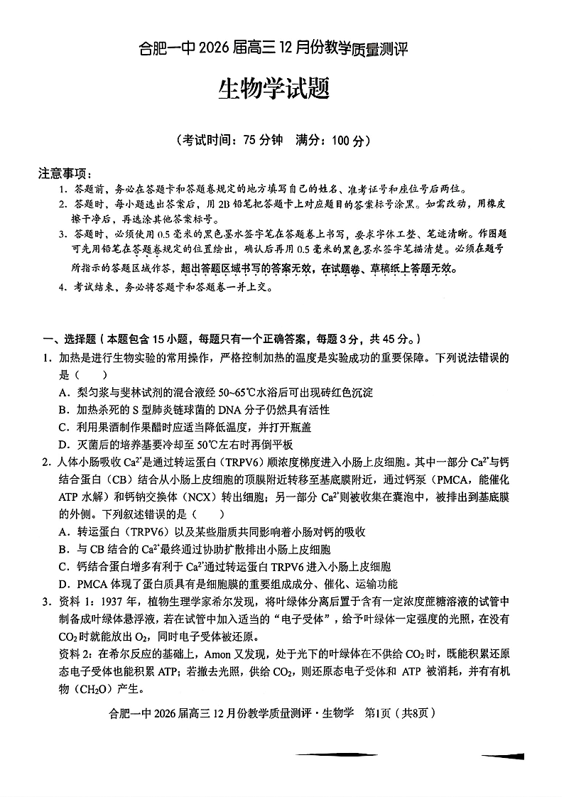 合肥一中2026届高三12月份教学质量测评 生物.pdf