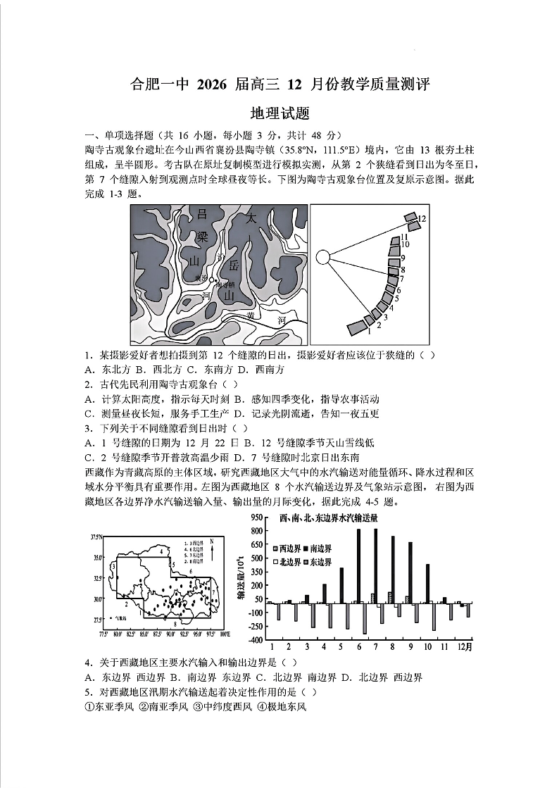 合肥一中2026届高三12月份教学质量测评 地理.pdf