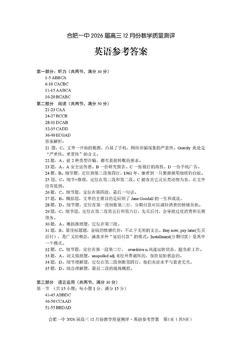 合肥一中2026届高三12月份教学质量测评 英语答案.pdf