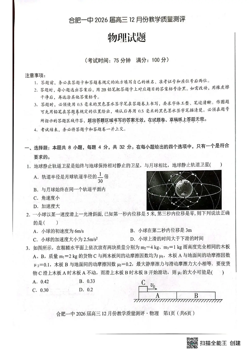合肥一中2026届高三12月份教学质量测评 物理.pdf