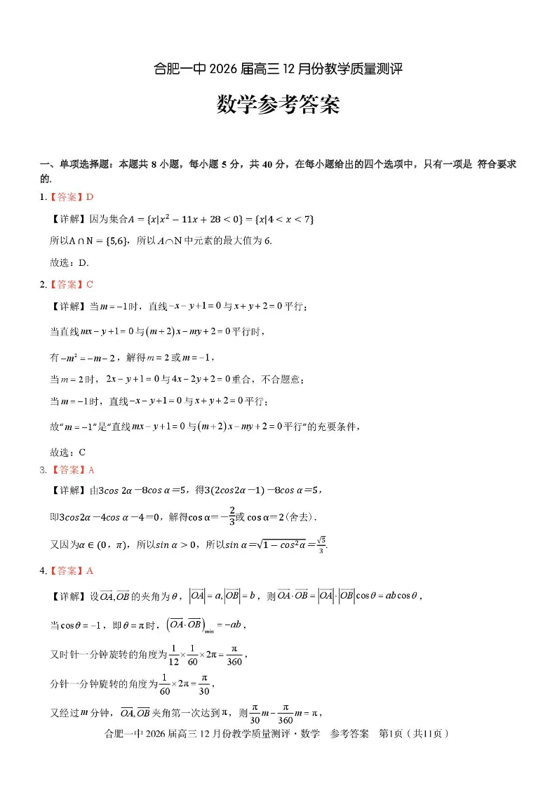 合肥一中2026届高三12月份教学质量测评 数学答案.pdf