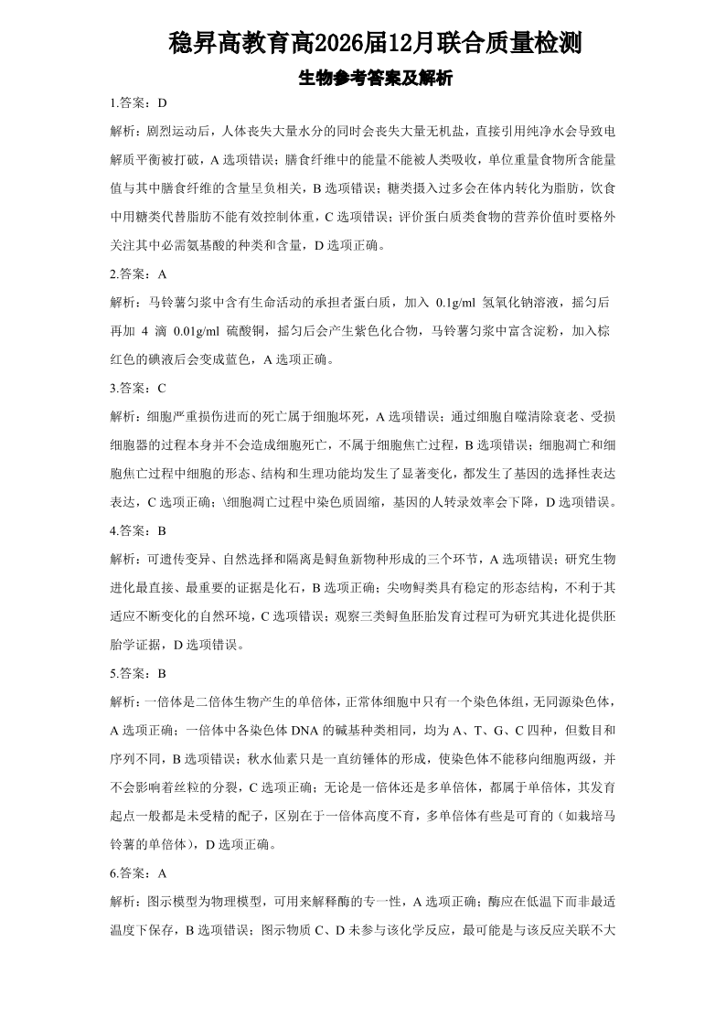 稳昇高教育2025-2026学年(上)高2026届12月联考 生物答案.pdf
