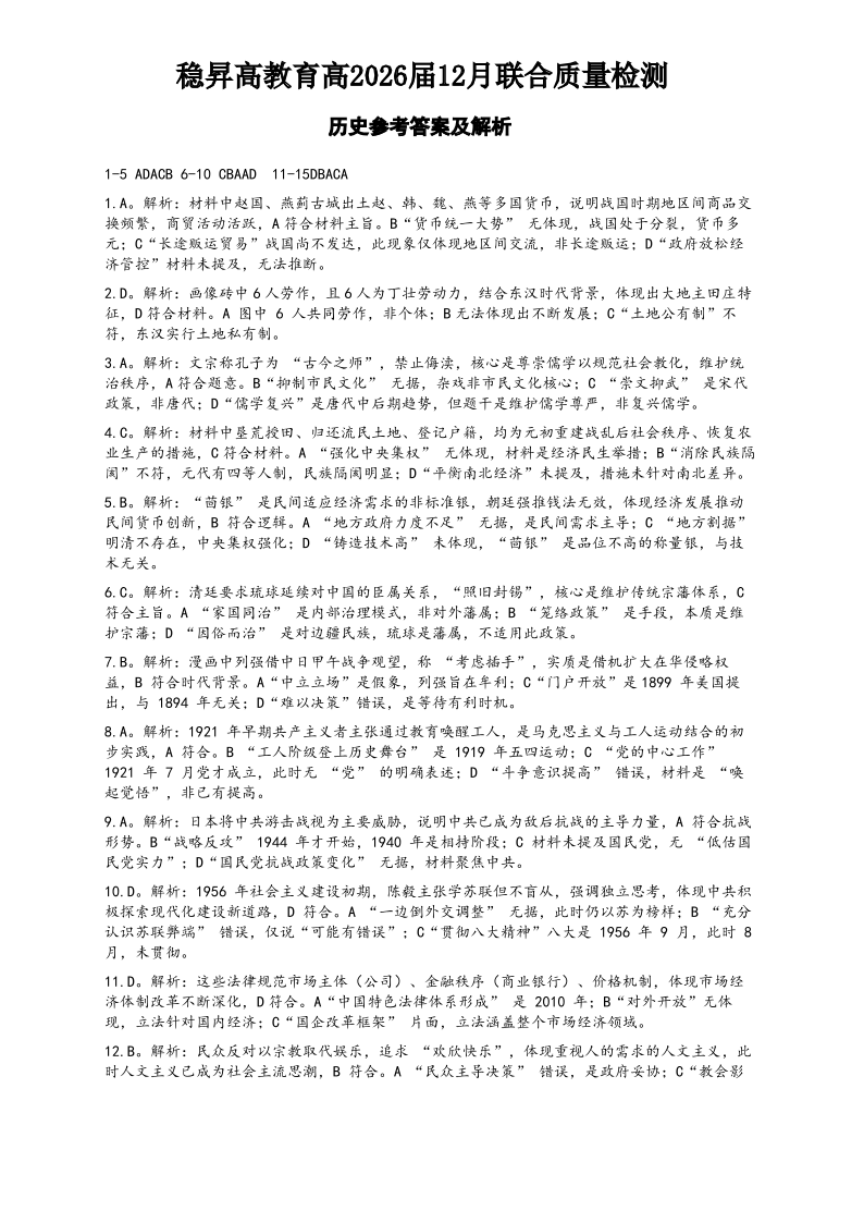 稳昇高教育2025-2026学年(上)高2026届12月联考 历史答案.pdf