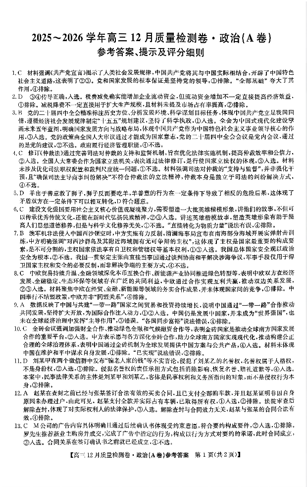 山西卓越联盟2025-2026学年高三12月质量检测卷 政治答案.pdf