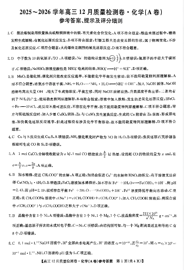 山西卓越联盟2025-2026学年高三12月质量检测卷 化学答案.pdf