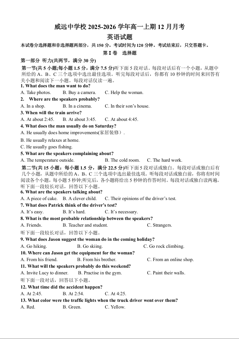 四川省内江市威远中学校2025-2026学年高一上学期12月月考 英语试题(含答案).docx