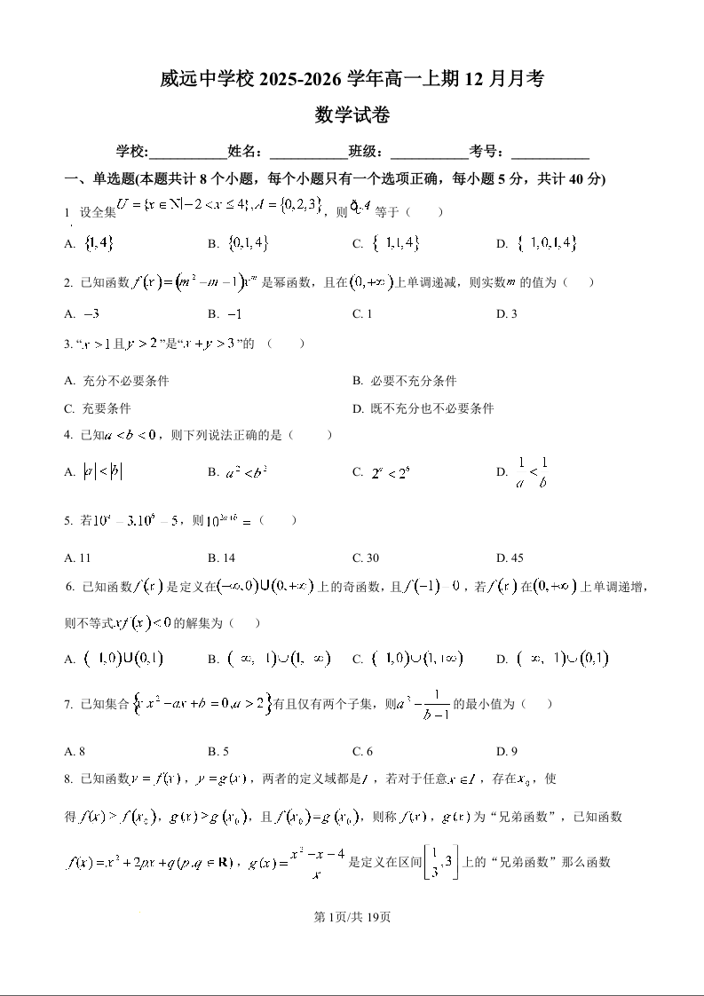 四川省内江市威远中学校2025-2026学年高一上学期12月月考 数学试题(含答案).docx
