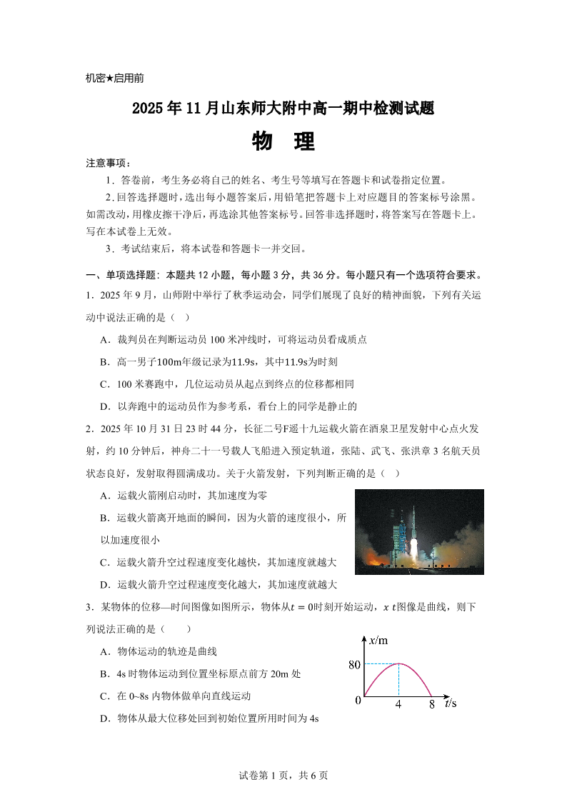 山东师范大学附属中学2025-2026学年高一上学期期中考试 物理试题(含答案).pdf