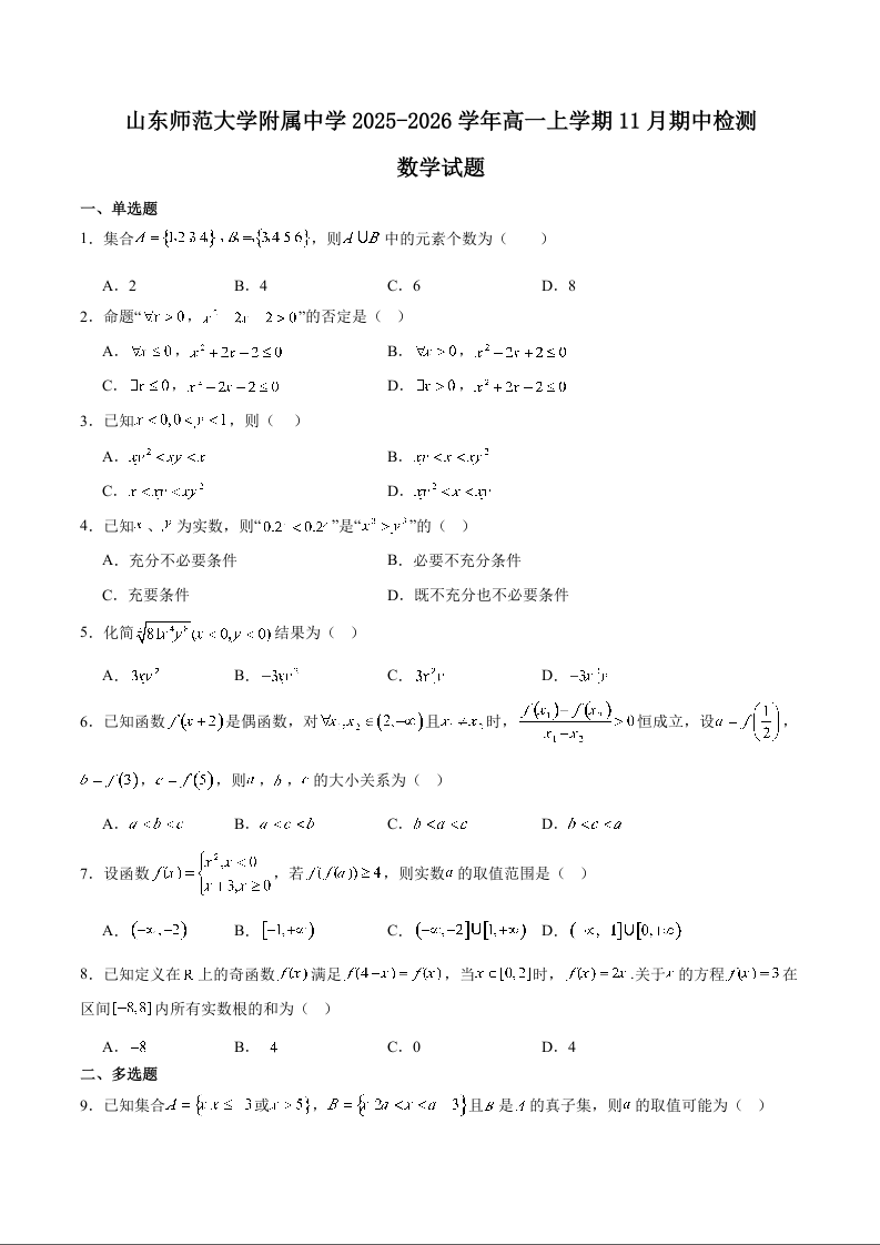 山东师范大学附属中学2025-2026学年高一上学期期中考试 数学试题(含答案).docx