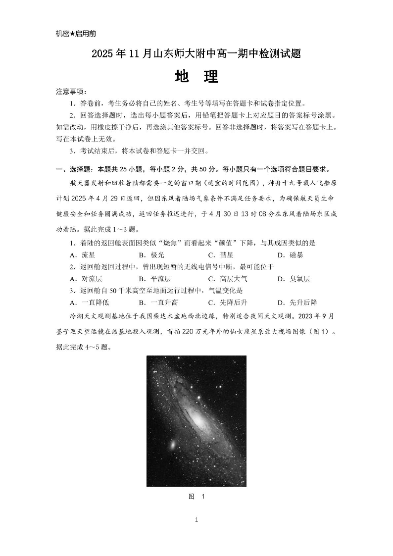 山东师范大学附属中学2025-2026学年高一上学期期中考试 地理试题(含答案).pdf