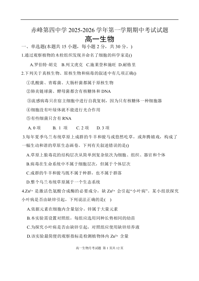 内蒙古自治区赤峰第四中学2025-2026学年高一上学期12月月考 生物.docx