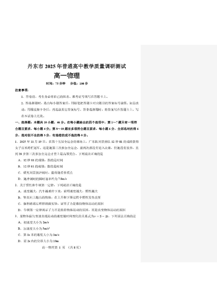 辽宁省丹东市2025-2026学年高一上学期教学质量调研测试 物理.pdf