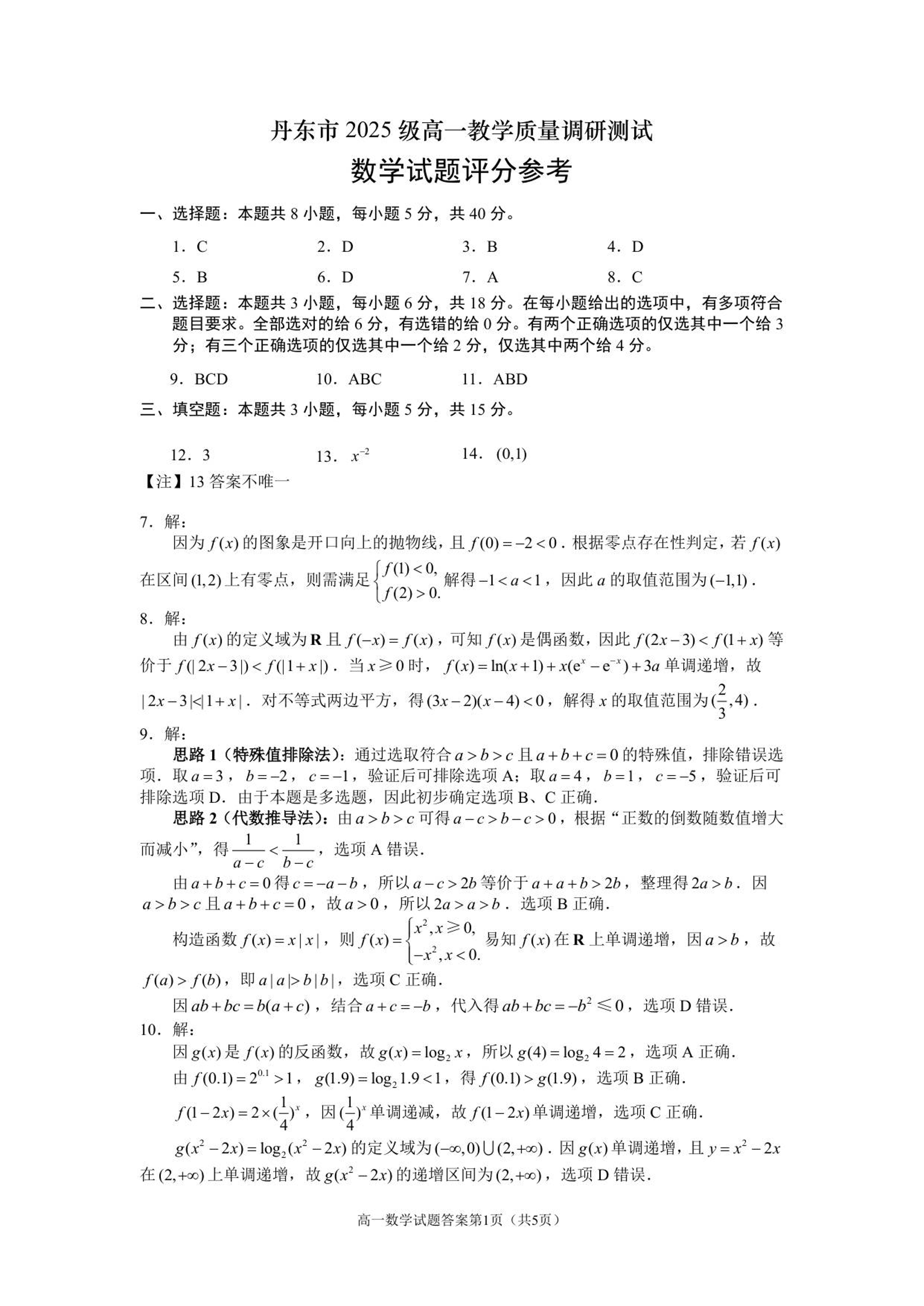 辽宁省丹东市2025-2026学年高一上学期教学质量调研测试 数学答案.pdf