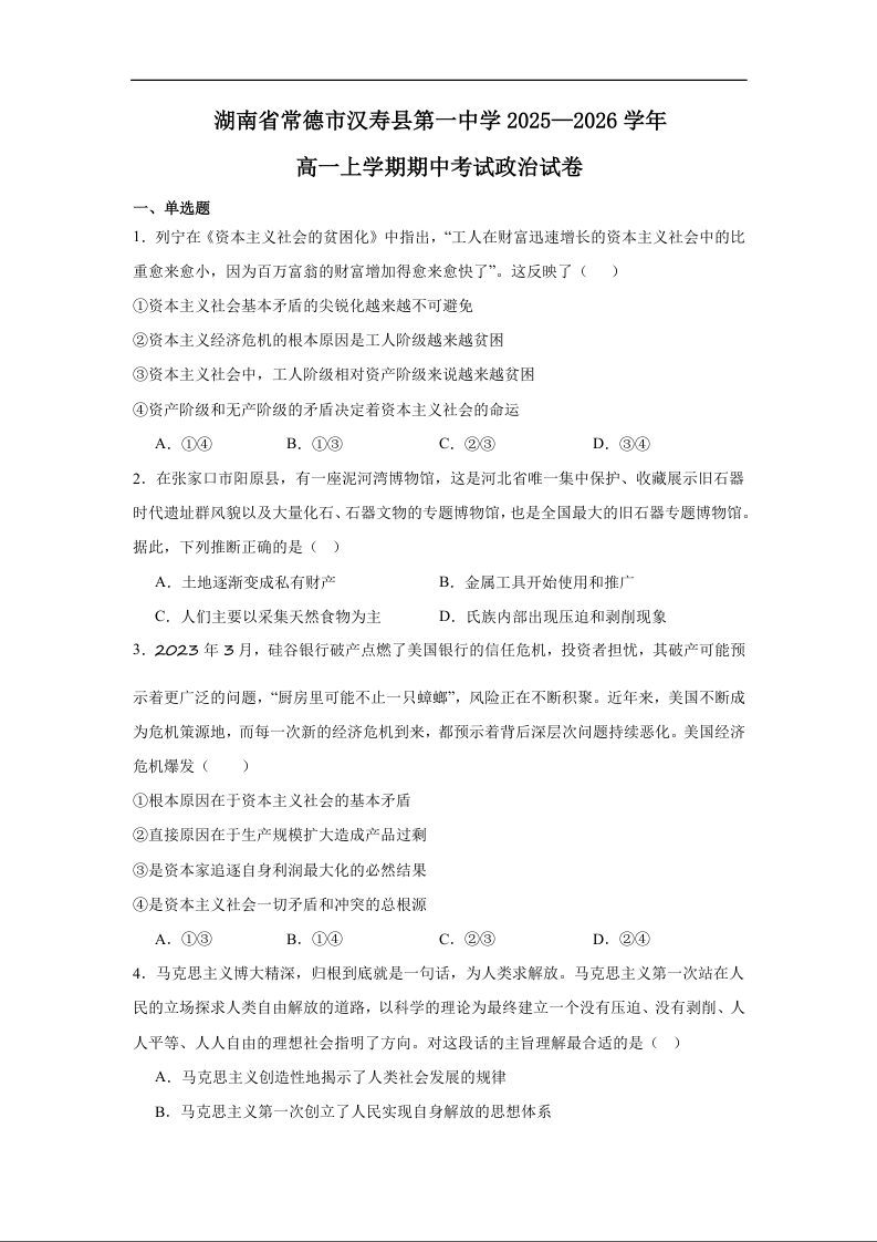 湖南省常德市汉寿县第一中学2025-2026学年高一上学期11月期中 政治试题(含答案).docx