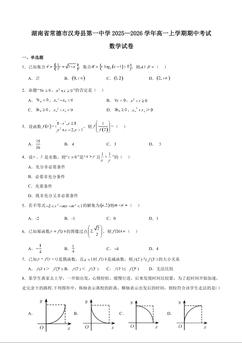 湖南省常德市汉寿县第一中学2025-2026学年高一上学期11月期中 数学试题(含答案).docx