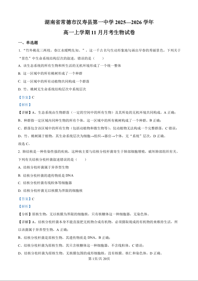湖南省常德市汉寿县第一中学2025-2026学年高一上学期11月期中 生物答案.docx