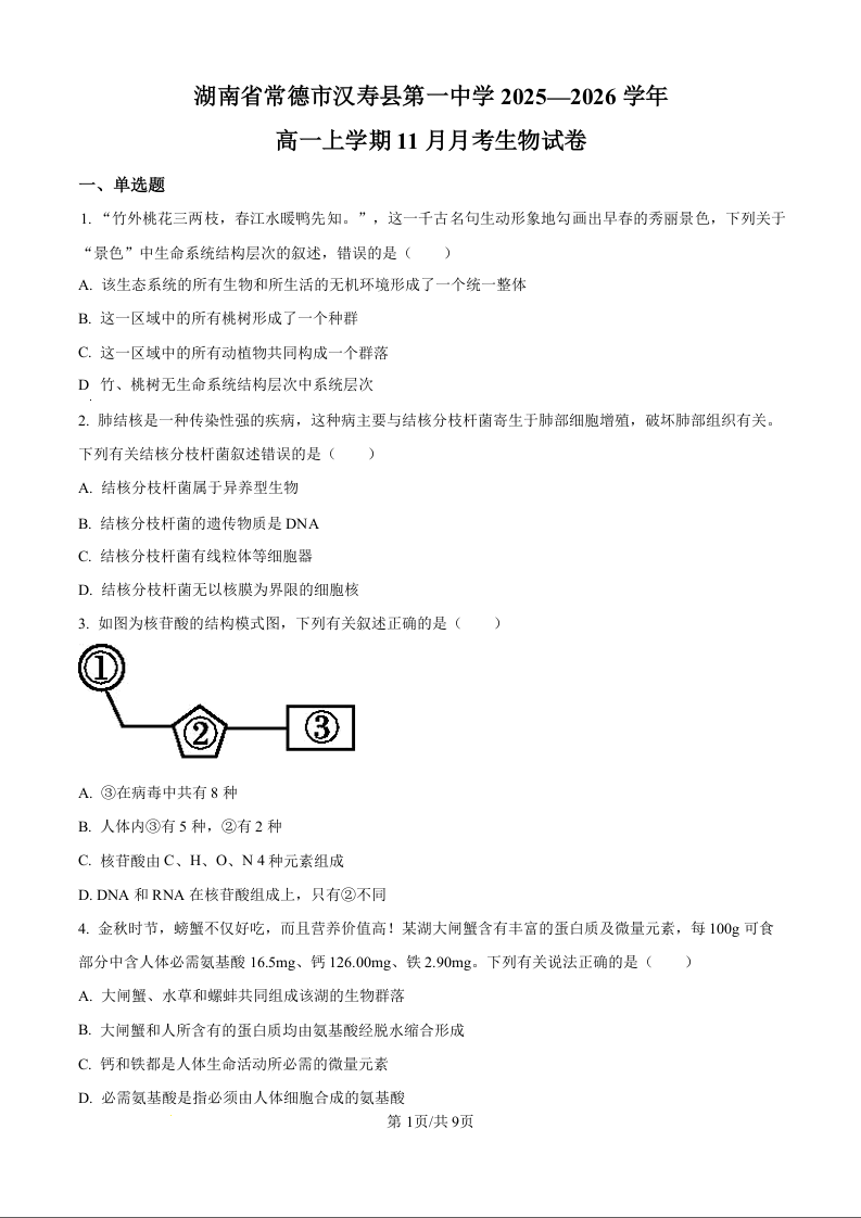 湖南省常德市汉寿县第一中学2025-2026学年高一上学期11月期中 生物.docx