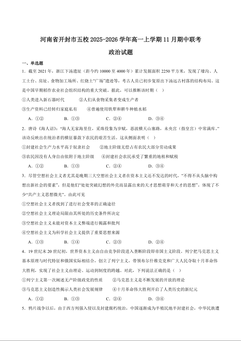 河南省开封市五校2025-2026学年高一上学期期中联考 政治试题(含答案).docx