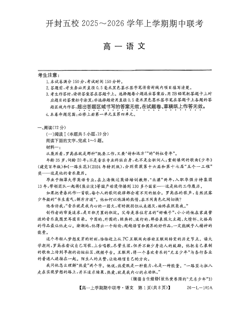 河南省开封市五校2025-2026学年高一上学期期中联考 语文试题(含答案).pdf