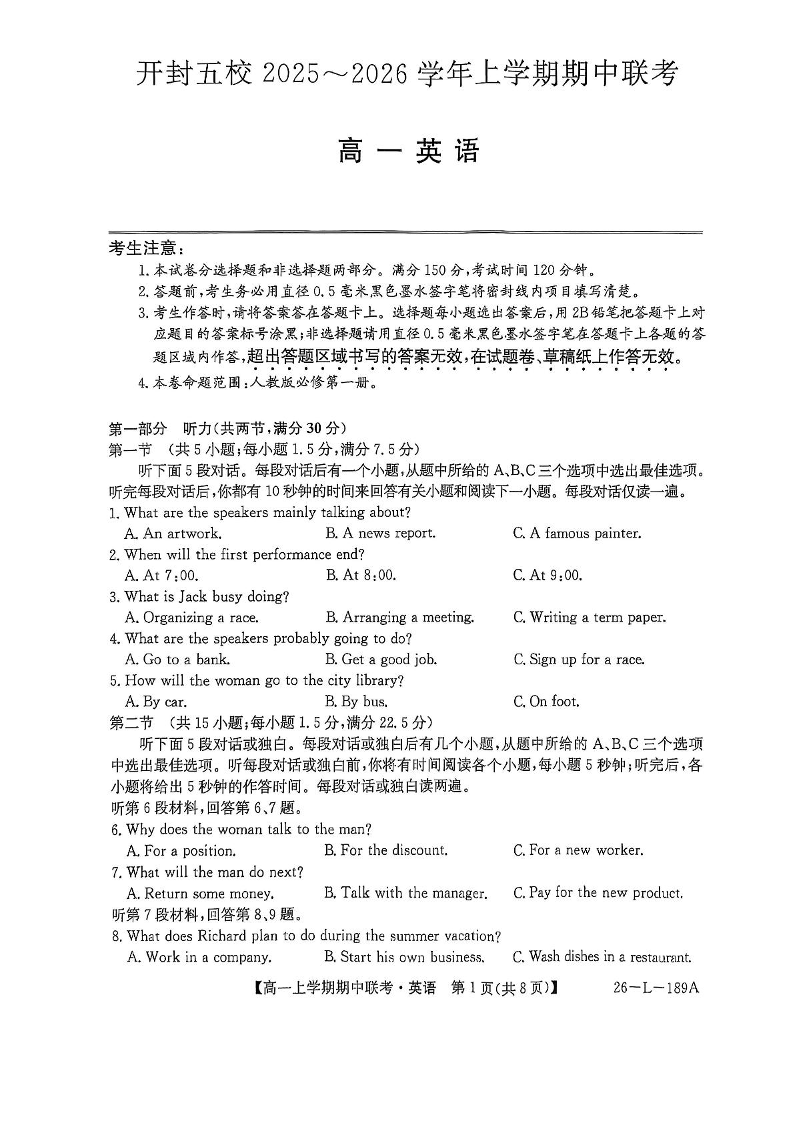 河南省开封市五校2025-2026学年高一上学期期中联考 英语试题(含答案).pdf