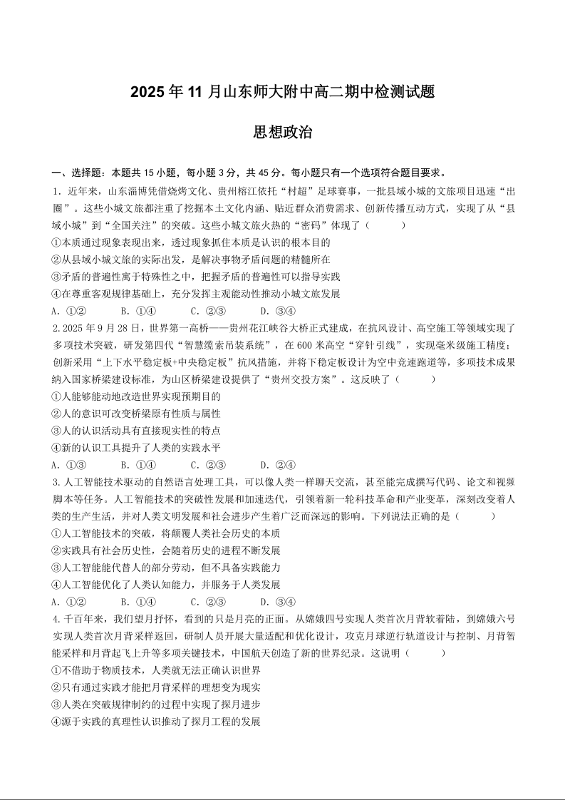 山东师范大学附属中学2025-2026学年高二上学期期中考试 政治试题(含答案).docx