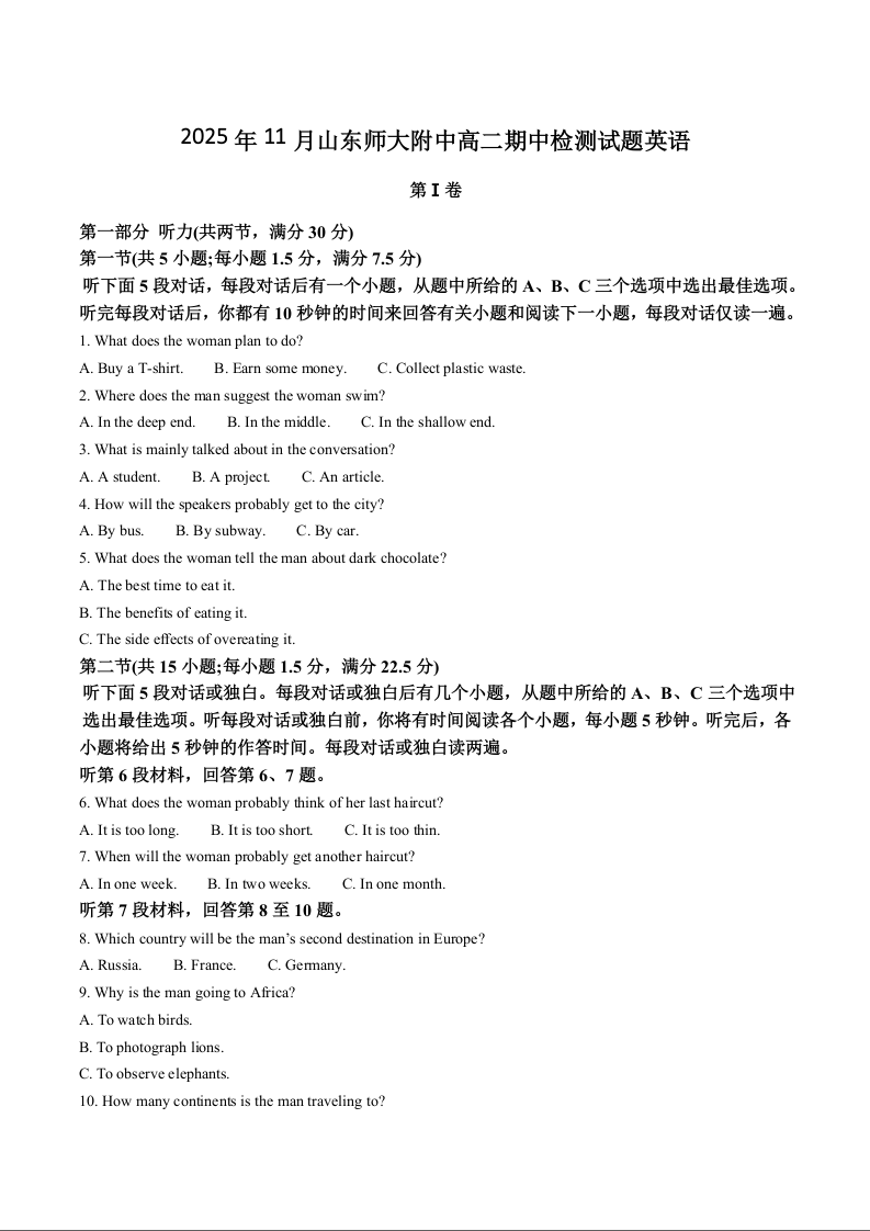 山东师范大学附属中学2025-2026学年高二上学期期中考试 英语试题(含答案).docx