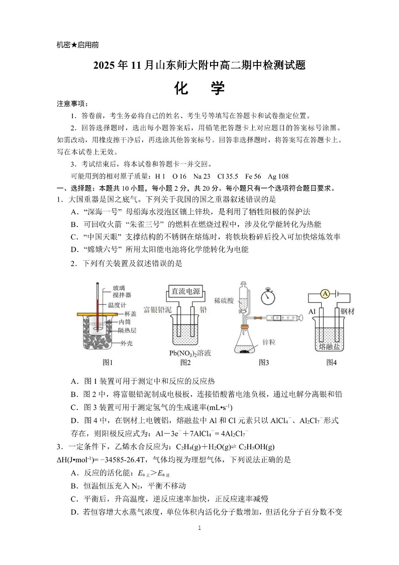 山东师范大学附属中学2025-2026学年高二上学期期中考试 化学试题(含答案).pdf