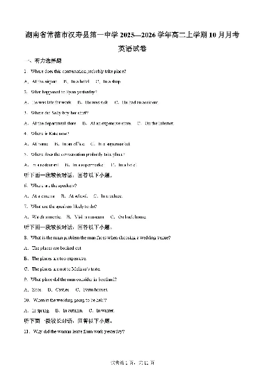 湖南省常德市汉寿县第一中学2025-2026学年高二上学期11月期中 英语试题(含答案).pdf