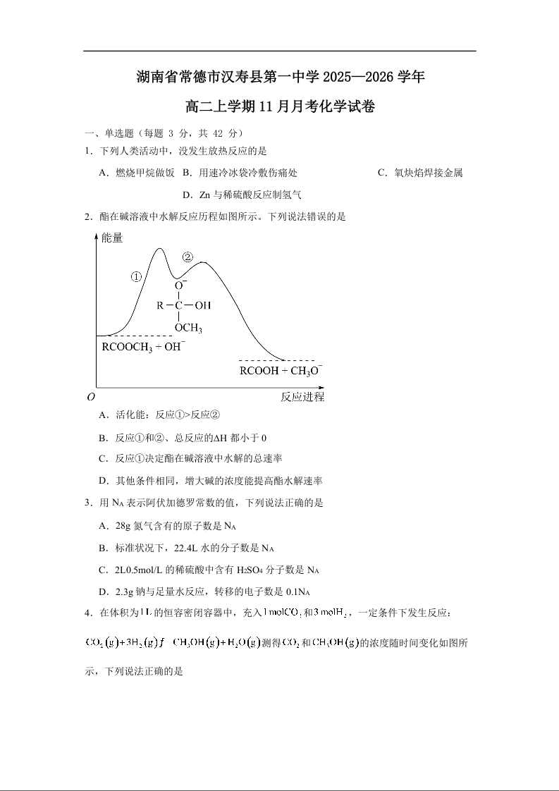 湖南省常德市汉寿县第一中学2025-2026学年高二上学期11月期中 化学试题(含答案).docx