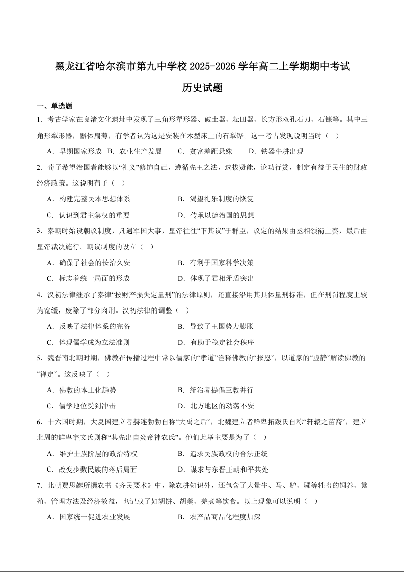 黑龙江省哈尔滨市第九中学2025-2026学年高二上学期期中考试 历史试题(含答案).docx