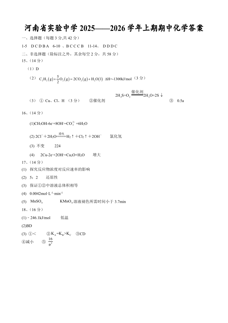 河南省实验中学2025-2026学年高二上学期期中考试 化学答案.pdf