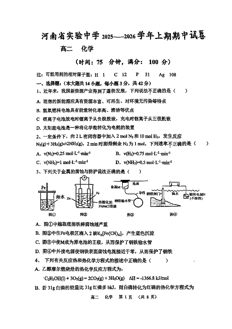 河南省实验中学2025-2026学年高二上学期期中考试 化学.pdf