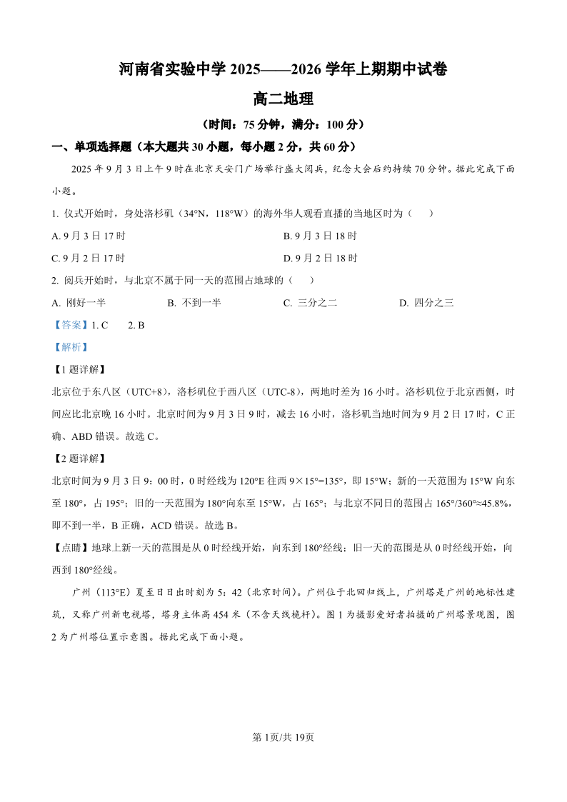 河南省实验中学2025-2026学年高二上学期期中考试 地理答案.pdf
