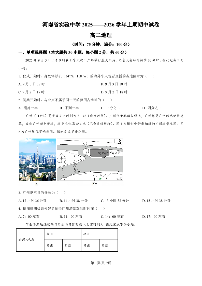 河南省实验中学2025-2026学年高二上学期期中考试 地理.pdf
