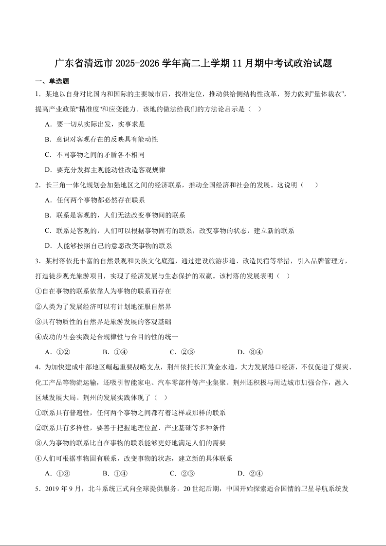 广东省清远市2025-2026学年高二上学期期中考试 政治试题(含答案).docx