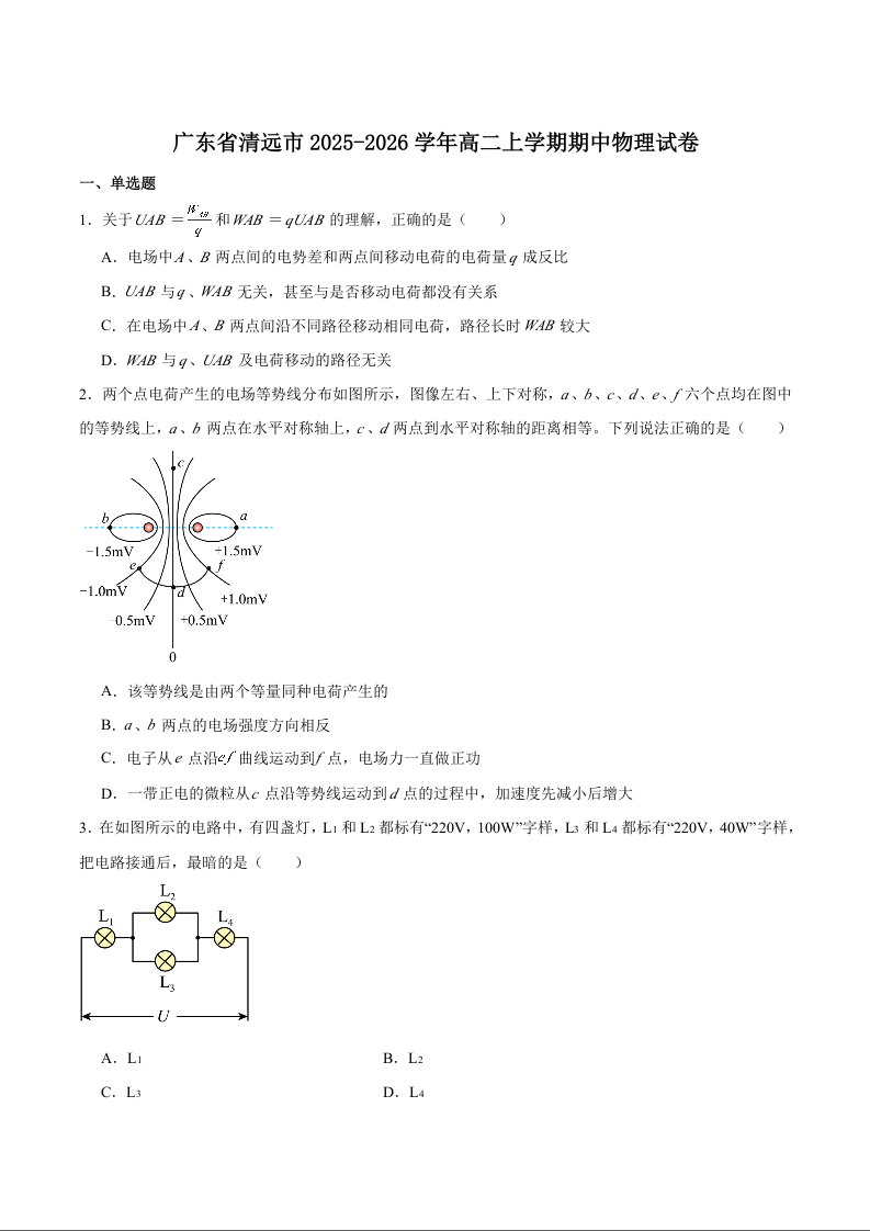 广东省清远市2025-2026学年高二上学期期中考试 物理试题(含答案).docx
