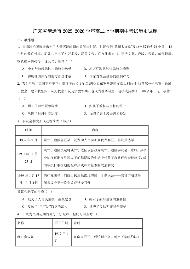 广东省清远市2025-2026学年高二上学期期中考试 历史试题(含答案).docx